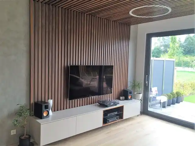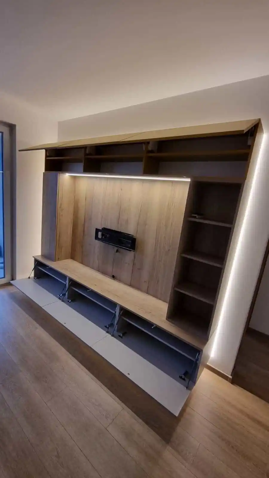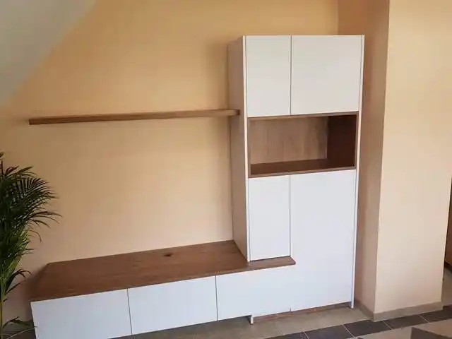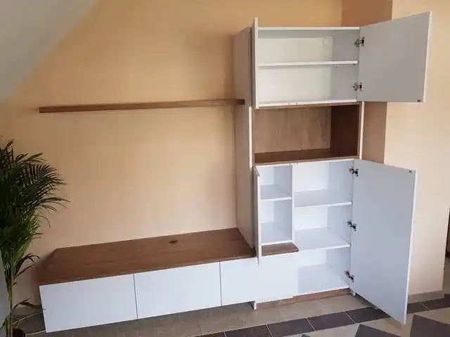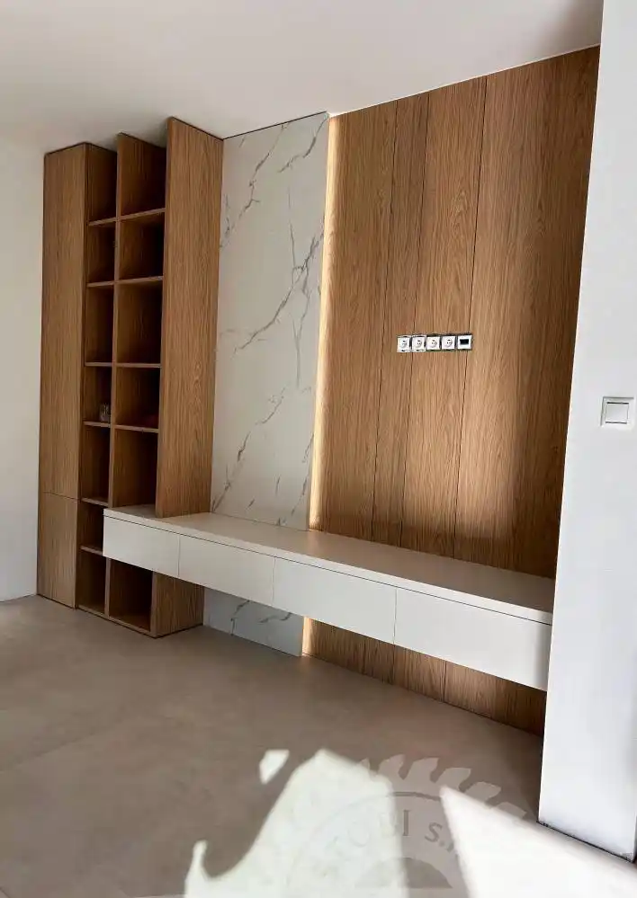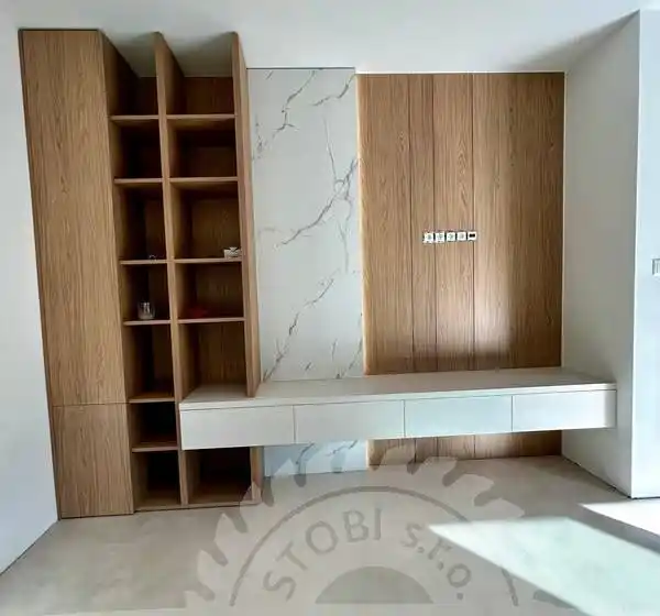 Naša výroba využíva CNC technológie a kvalitné materiály, ktoré umožňujú realizovať aj náročné a atypické riešenia – od vstavaných knižníc cez TV steny až po dizajnové úložné systémy. Každý detail je premyslený tak, aby slúžil dlhé roky.